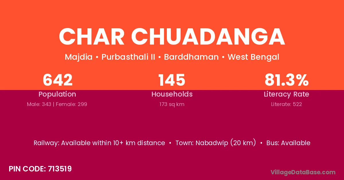 Nabadwip (20 km) is the nearest town to Char Chuadanga village for major economic activities and is located approximately 20 km away.