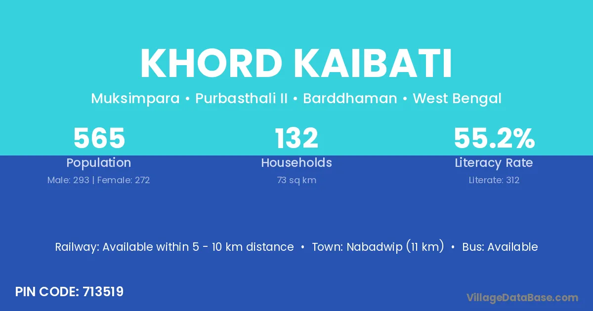 Nabadwip (11 km) is the nearest town to Khord Kaibati village for major economic activities and is located approximately 11 km away.