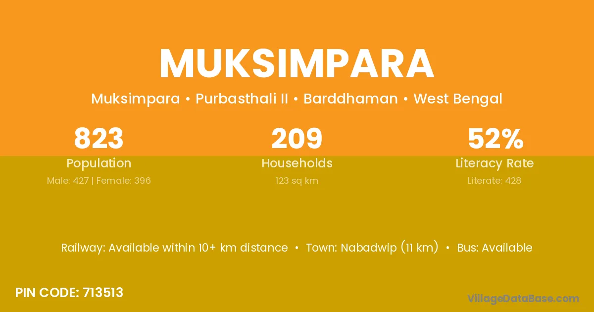 Nabadwip (11 km) is the nearest town to Muksimpara village for major economic activities and is located approximately 11 km away.