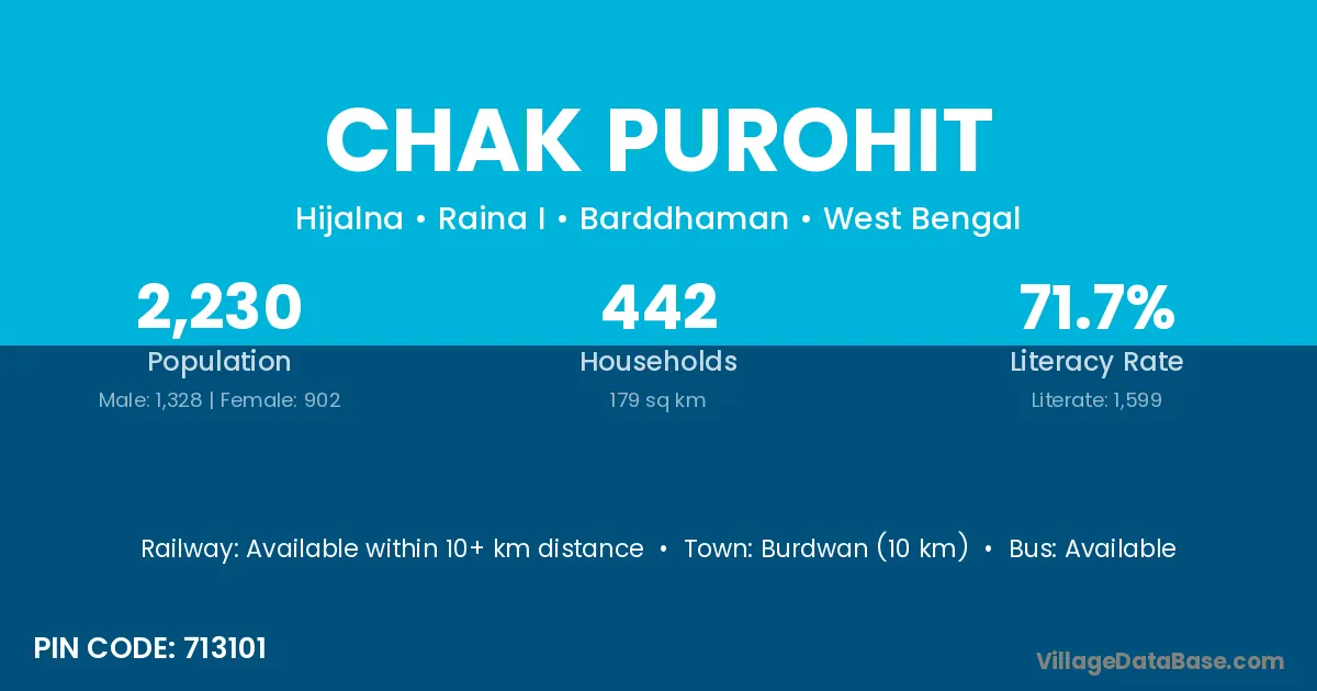 Burdwan (10 km) is the nearest town to Chak Purohit village for major economic activities and is located approximately 10 km away.