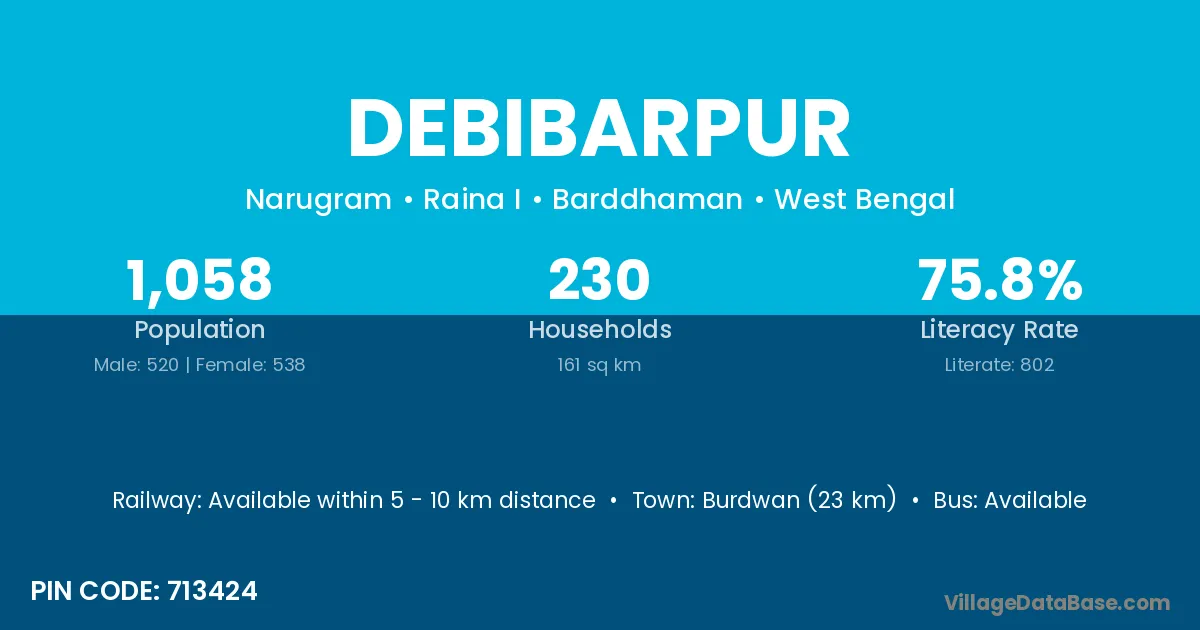 Burdwan (23 km) is the nearest town to Debibarpur village for major economic activities and is located approximately 23 km away.