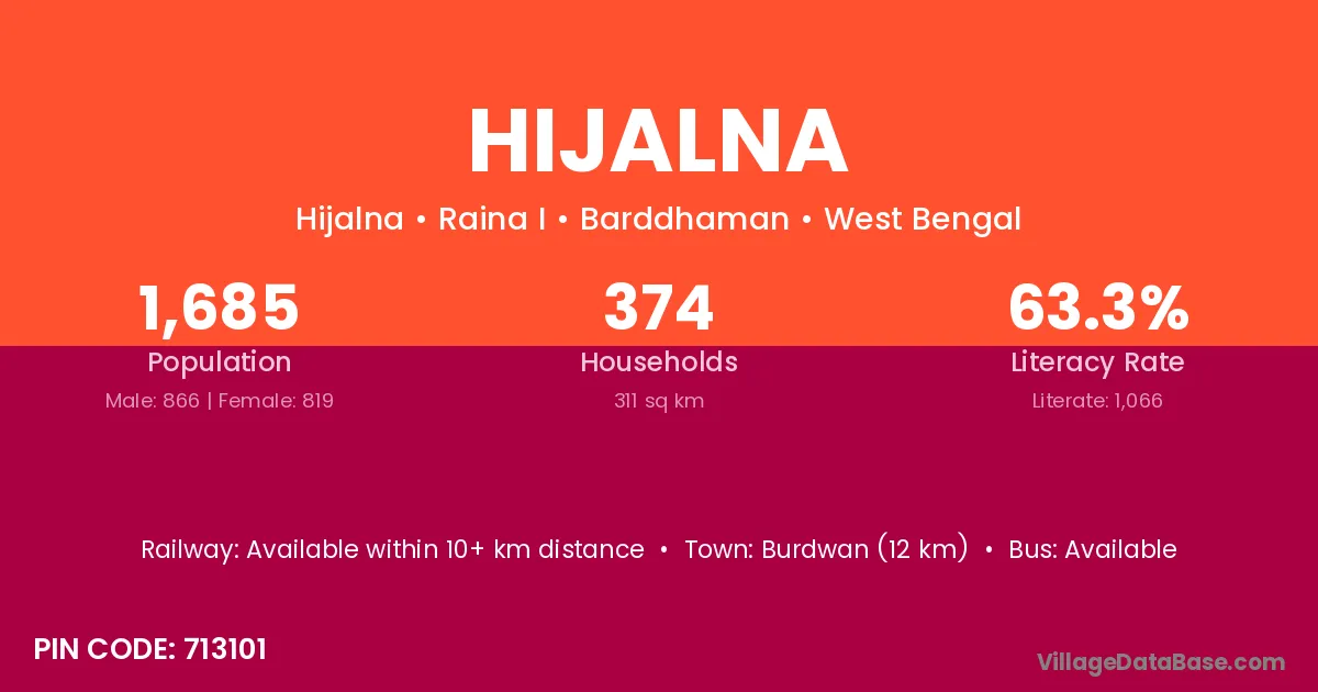 Burdwan (12 km) is the nearest town to Hijalna village for major economic activities and is located approximately 12 km away.