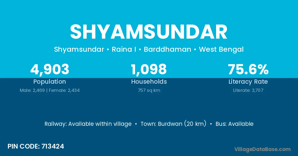 Burdwan (20 km) is the nearest town to Shyamsundar village for major economic activities and is located approximately 20 km away.