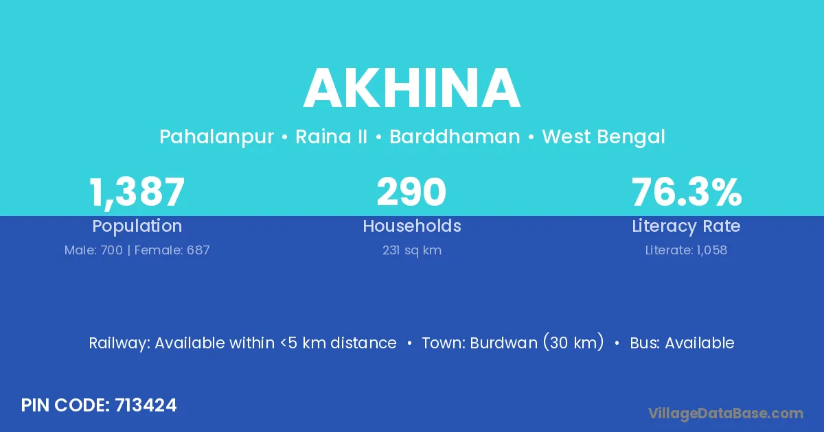 Burdwan (30 km) is the nearest town to Akhina village for major economic activities and is located approximately 30 km away.