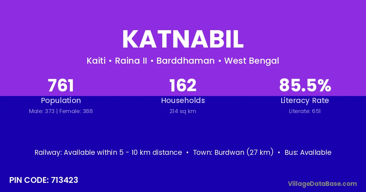 Burdwan (27 km) is the nearest town to Katnabil village for major economic activities and is located approximately 27 km away.