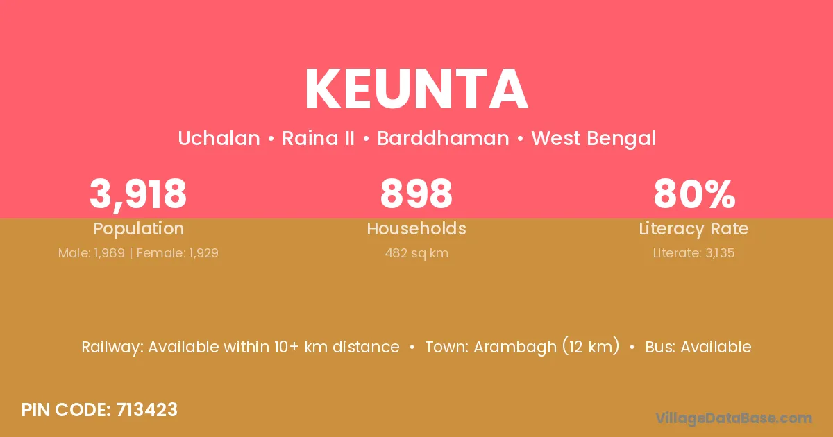 Arambagh (12 km) is the nearest town to Keunta village for major economic activities and is located approximately 12 km away.