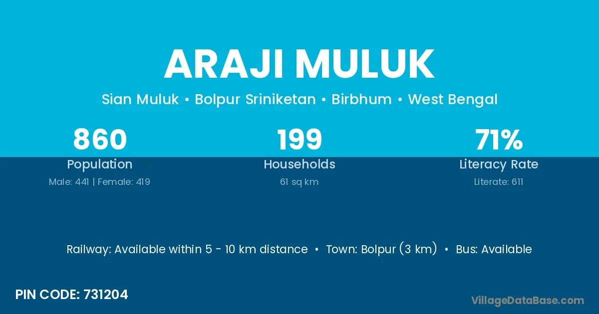 Bolpur (3 km) is the nearest town to Araji Muluk village for major economic activities and is located approximately 3 km away.