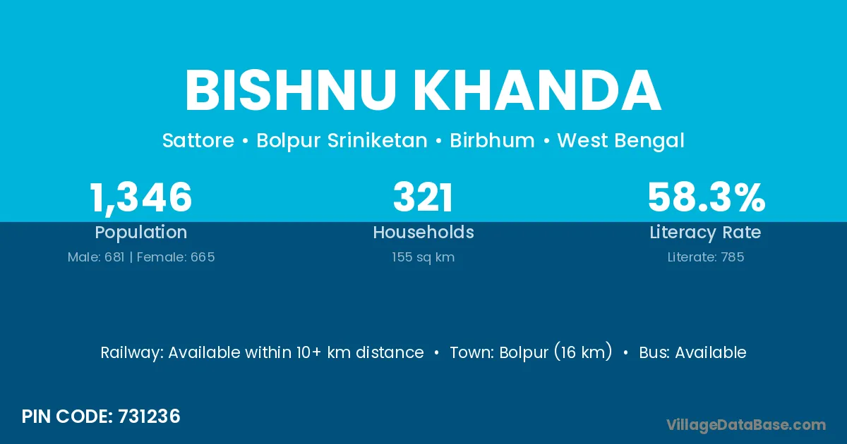 Bolpur (16 km) is the nearest town to Bishnu Khanda village for major economic activities and is located approximately 16 km away.