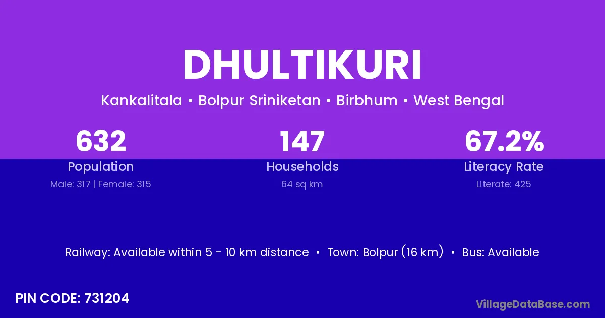 Bolpur (16 km) is the nearest town to Dhultikuri village for major economic activities and is located approximately 16 km away.