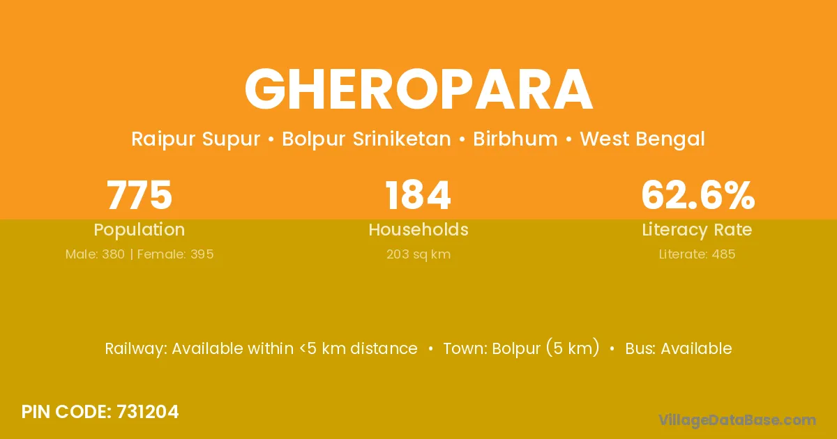 Bolpur (5 km) is the nearest town to Gheropara village for major economic activities and is located approximately 5 km away.