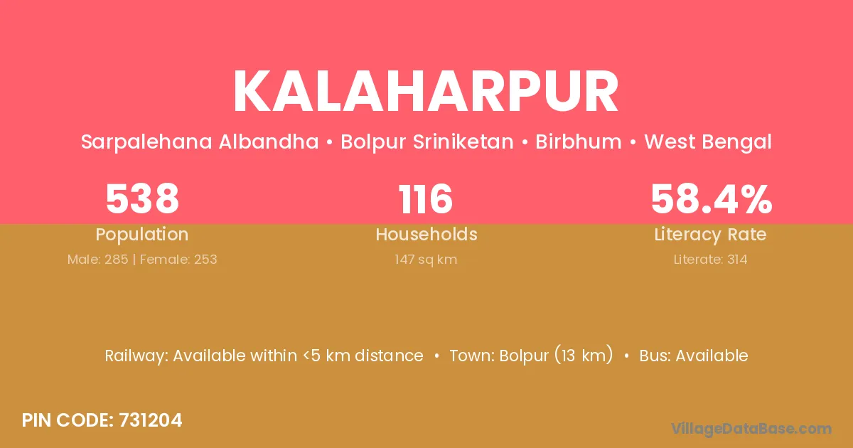 Bolpur (13 km) is the nearest town to Kalaharpur village for major economic activities and is located approximately 13 km away.