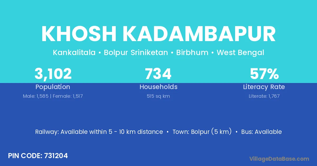 Bolpur (5 km) is the nearest town to Khosh Kadambapur village for major economic activities and is located approximately 5 km away.