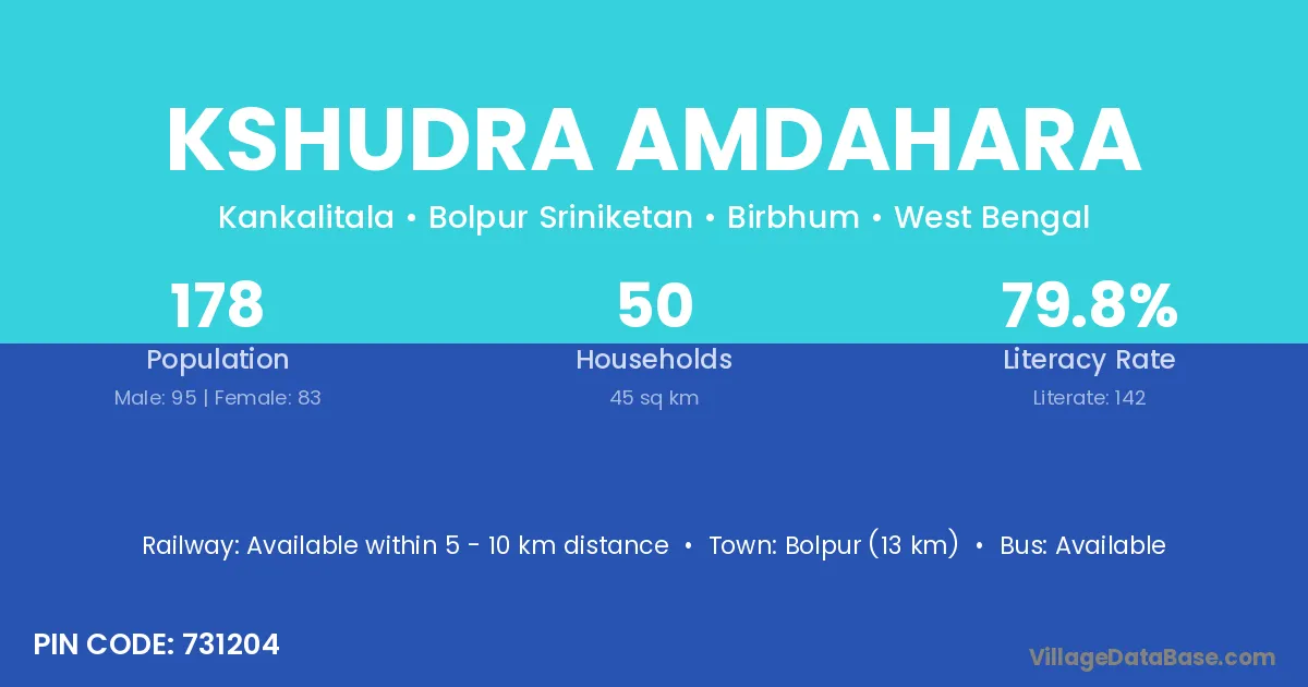 Bolpur (13 km) is the nearest town to Kshudra Amdahara village for major economic activities and is located approximately 13 km away.