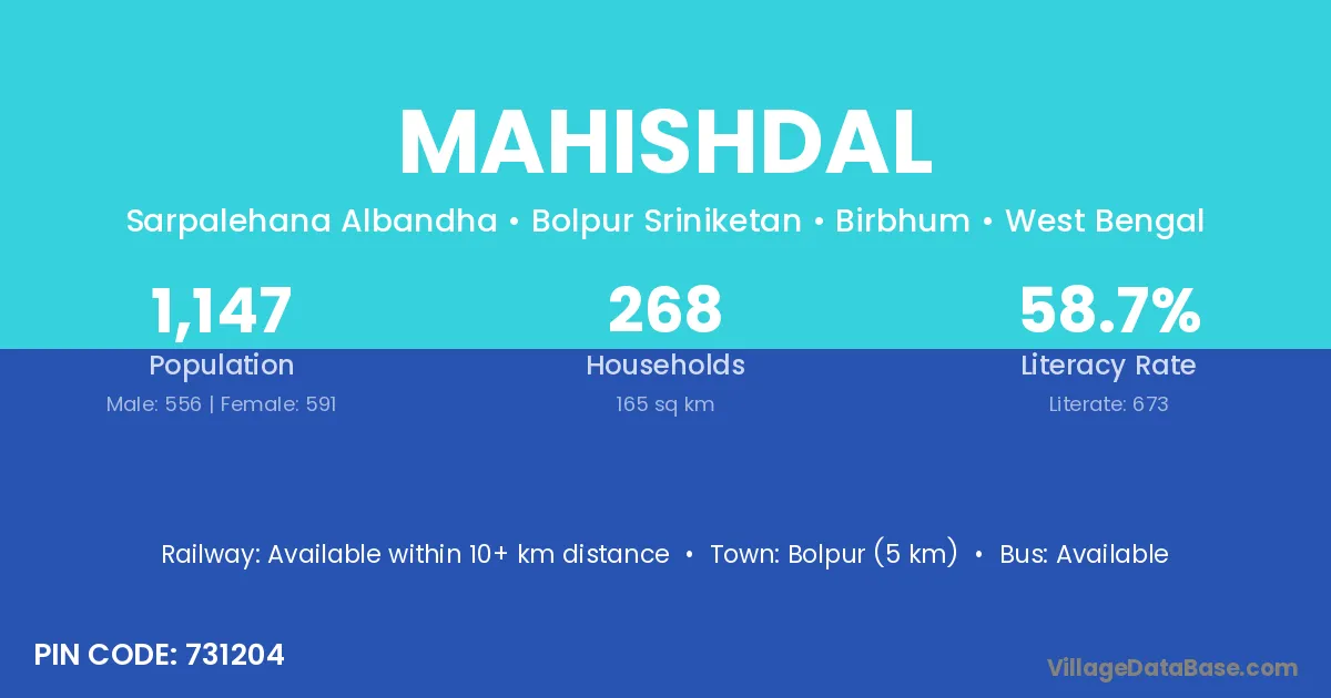 Bolpur (5 km) is the nearest town to Mahishdal village for major economic activities and is located approximately 5 km away.