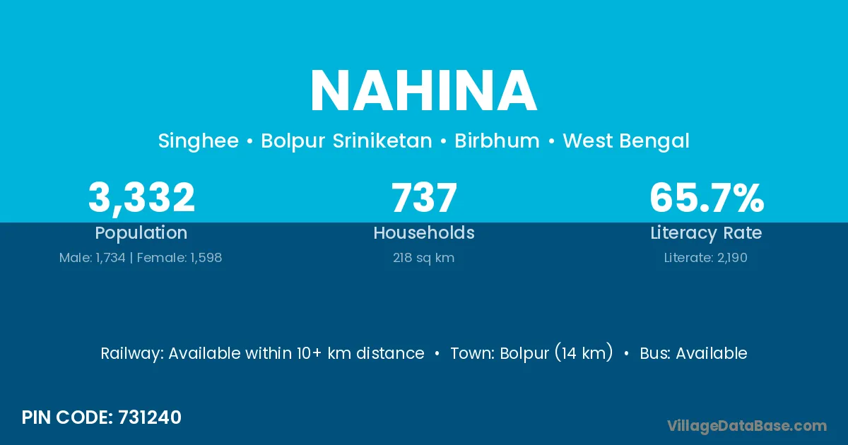 Bolpur (14 km) is the nearest town to Nahina village for major economic activities and is located approximately 14 km away.