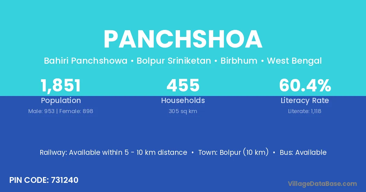 Bolpur (10 km) is the nearest town to Panchshoa village for major economic activities and is located approximately 10 km away.
