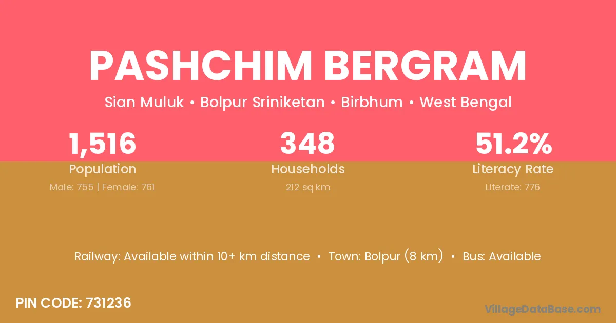 Bolpur (8 km) is the nearest town to Pashchim Bergram village for major economic activities and is located approximately 8 km away.