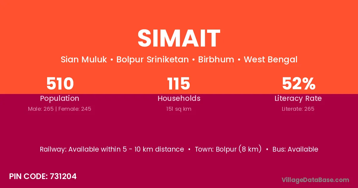 Bolpur (8 km) is the nearest town to Simait village for major economic activities and is located approximately 8 km away.