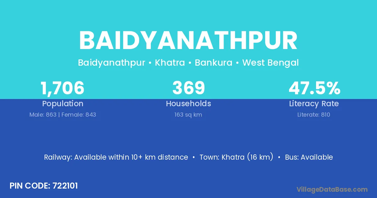 Dubrajpur (10 km) is the nearest town to Baidyanathpur village for major economic activities and is located approximately 10 km away.