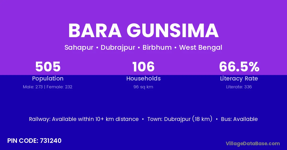 Dubrajpur (18 km) is the nearest town to Bara Gunsima village for major economic activities and is located approximately 18 km away.