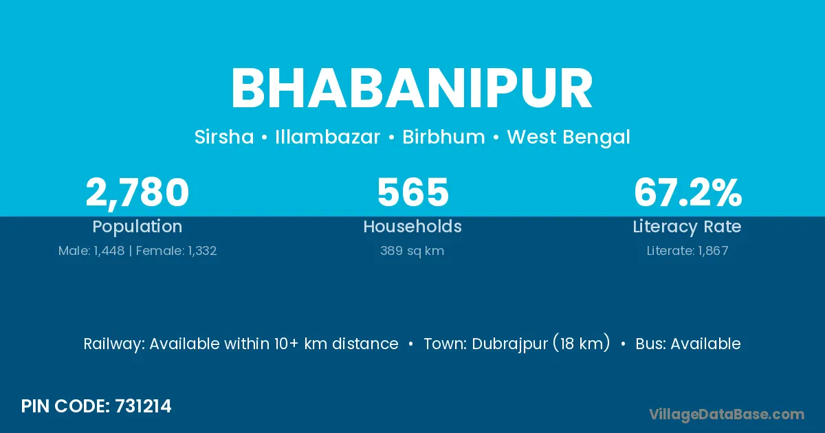Dubrajpur (5 km) is the nearest town to Bhabanipur village for major economic activities and is located approximately 5 km away.