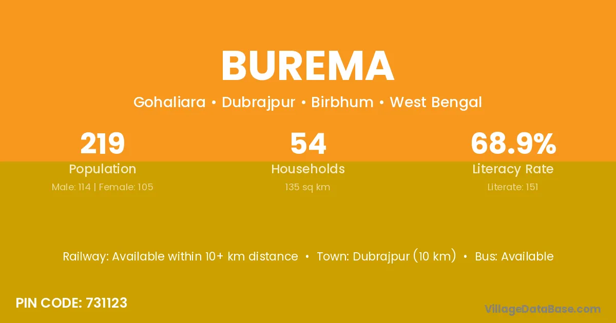 Dubrajpur (10 km) is the nearest town to Burema village for major economic activities and is located approximately 10 km away.