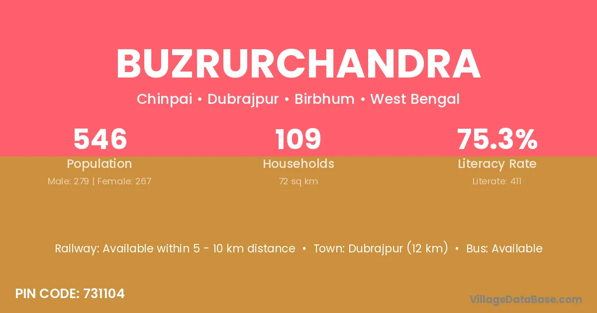 Dubrajpur (12 km) is the nearest town to Buzrurchandra village for major economic activities and is located approximately 12 km away.