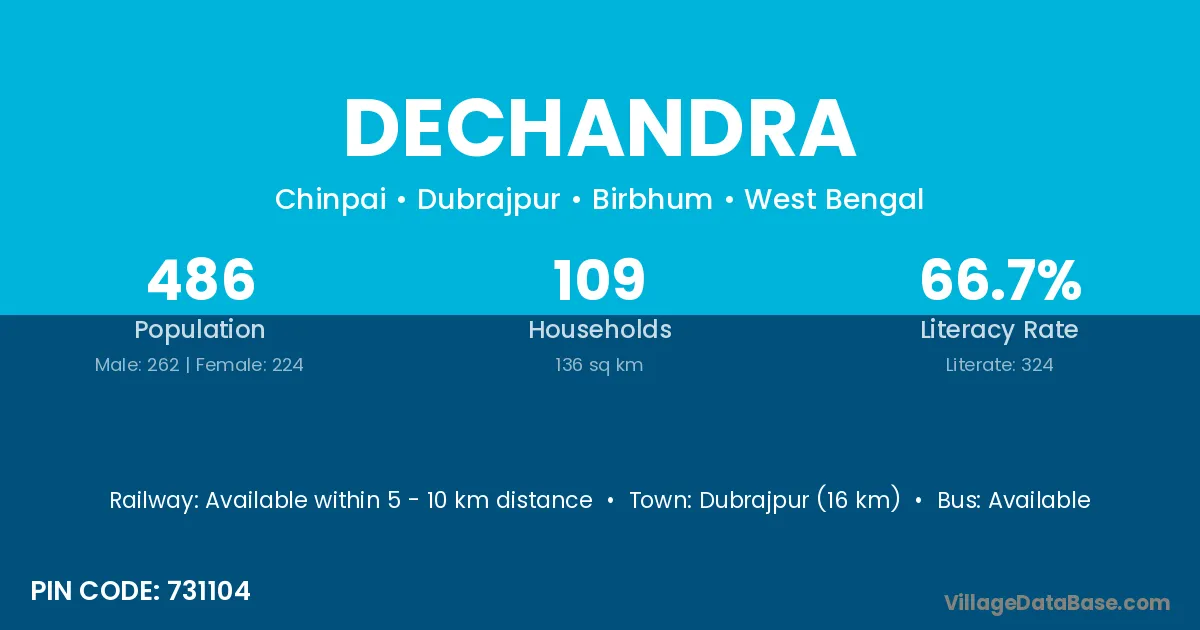 Dubrajpur (16 km) is the nearest town to Dechandra village for major economic activities and is located approximately 16 km away.