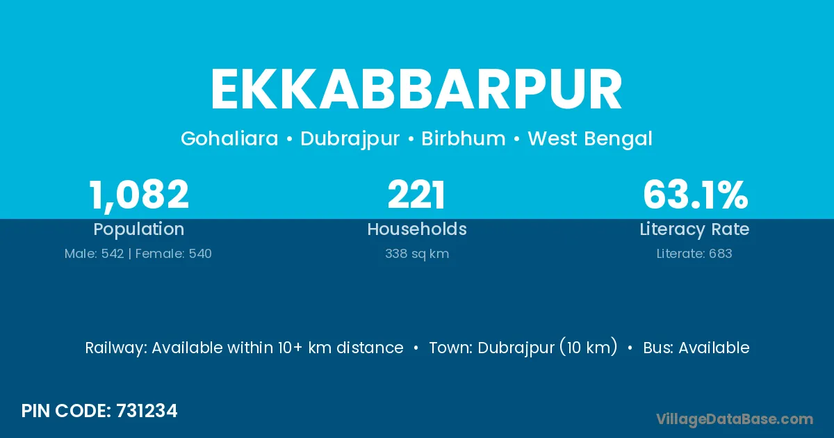 Dubrajpur (10 km) is the nearest town to Ekkabbarpur village for major economic activities and is located approximately 10 km away.
