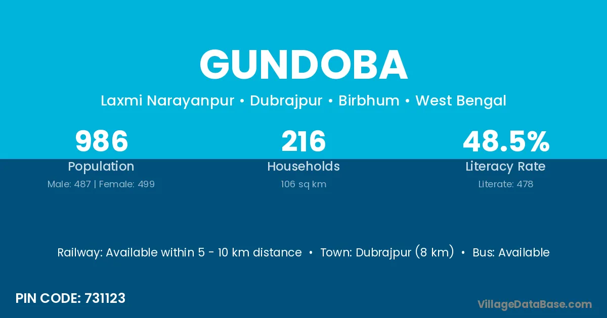 Dubrajpur (8 km) is the nearest town to Gundoba village for major economic activities and is located approximately 8 km away.