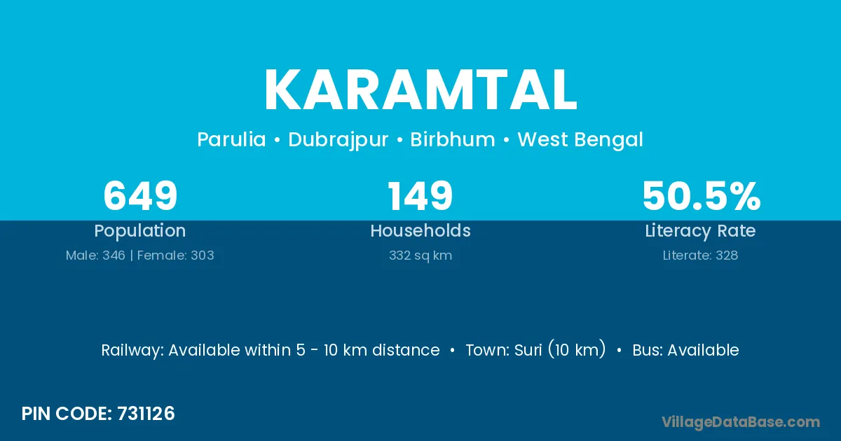Suri (10 km) is the nearest town to Karamtal village for major economic activities and is located approximately 10 km away.