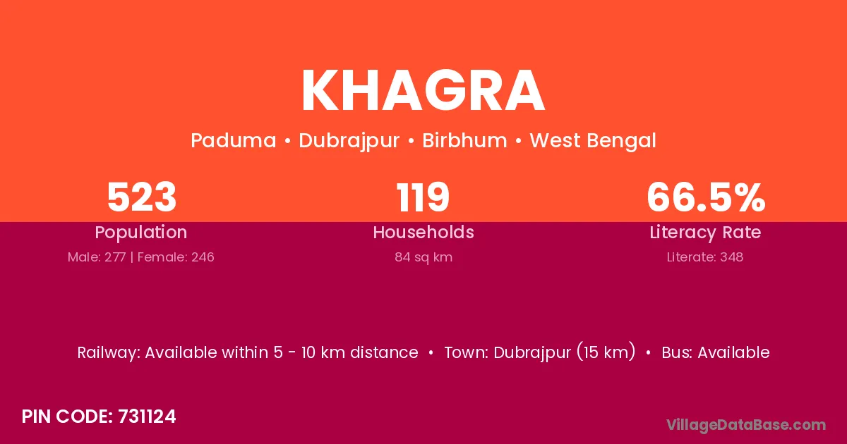Dubrajpur (15 km) is the nearest town to Khagra village for major economic activities and is located approximately 15 km away.