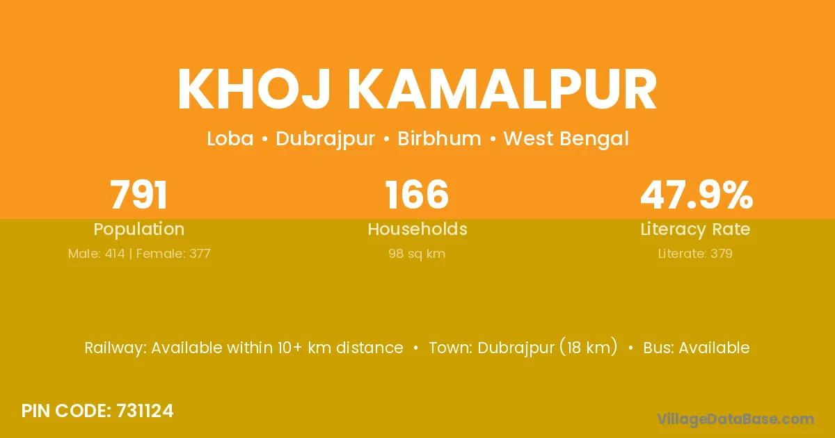 Dubrajpur (18 km) is the nearest town to Khoj Kamalpur village for major economic activities and is located approximately 18 km away.