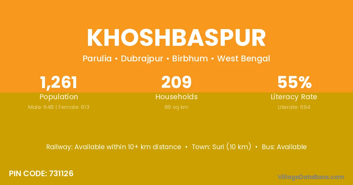 Suri (10 km) is the nearest town to Khoshbaspur village for major economic activities and is located approximately 10 km away.