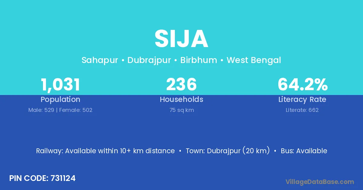 Dubrajpur (20 km) is the nearest town to Sija village for major economic activities and is located approximately 20 km away.