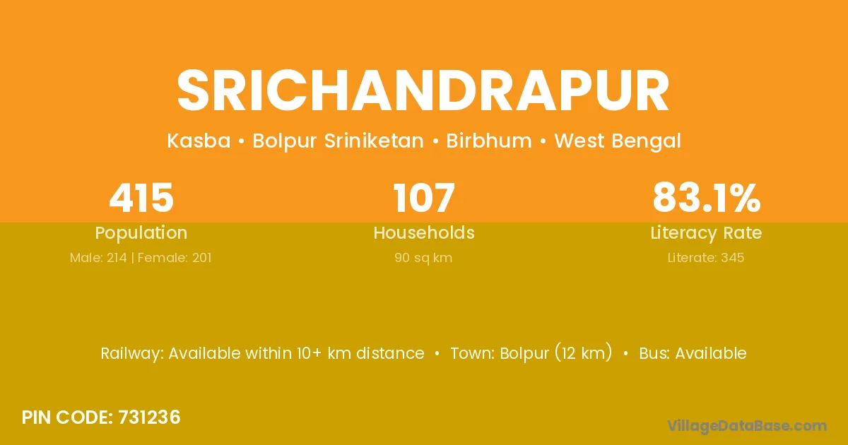 Dubrajpur (5 km) is the nearest town to Srichandrapur village for major economic activities and is located approximately 5 km away.