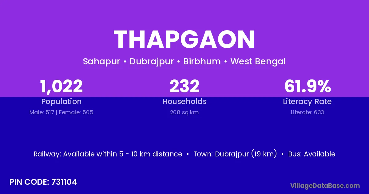 Dubrajpur (19 km) is the nearest town to Thapgaon village for major economic activities and is located approximately 19 km away.