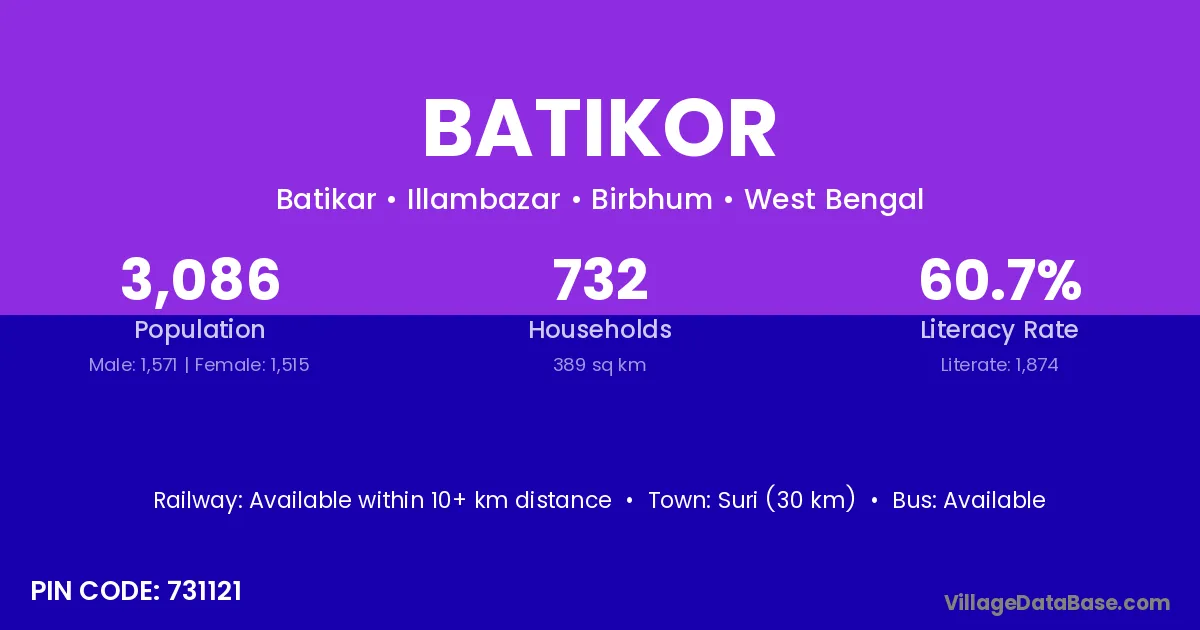 Suri (30 km) is the nearest town to Batikor village for major economic activities and is located approximately 30 km away.