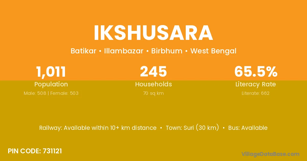 Suri (30 km) is the nearest town to Ikshusara village for major economic activities and is located approximately 30 km away.