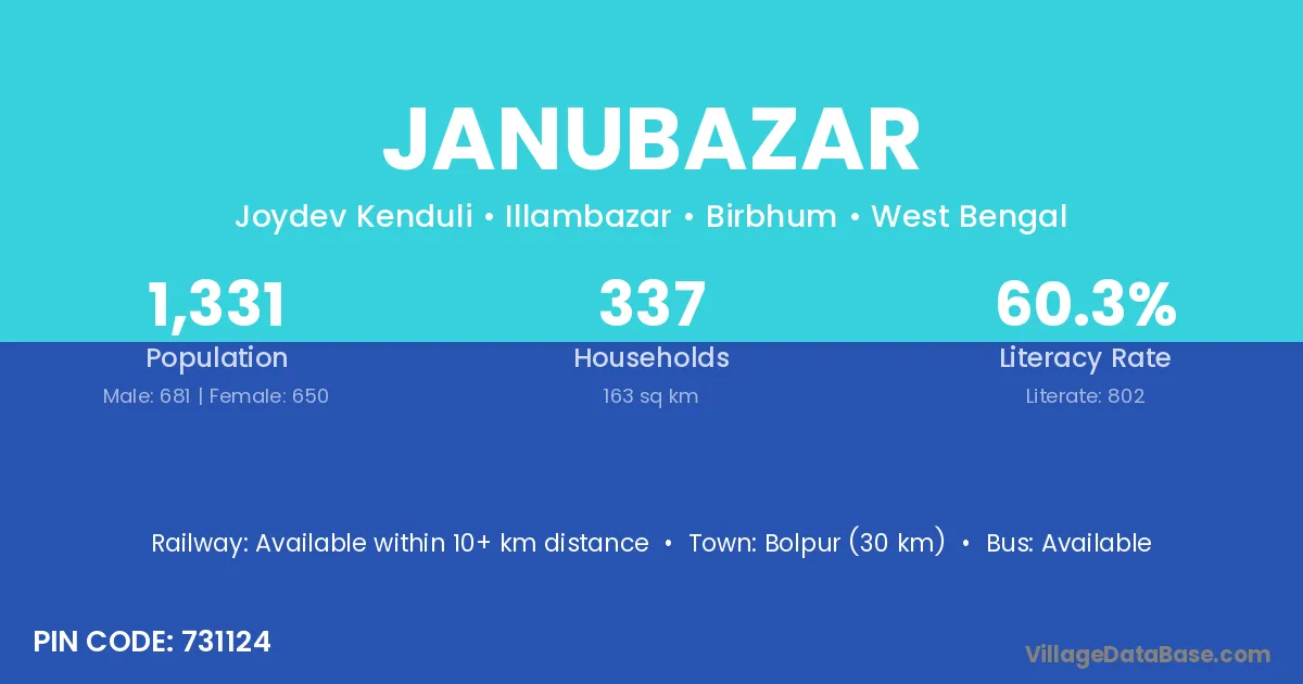 Bolpur (30 km) is the nearest town to Janubazar village for major economic activities and is located approximately 30 km away.