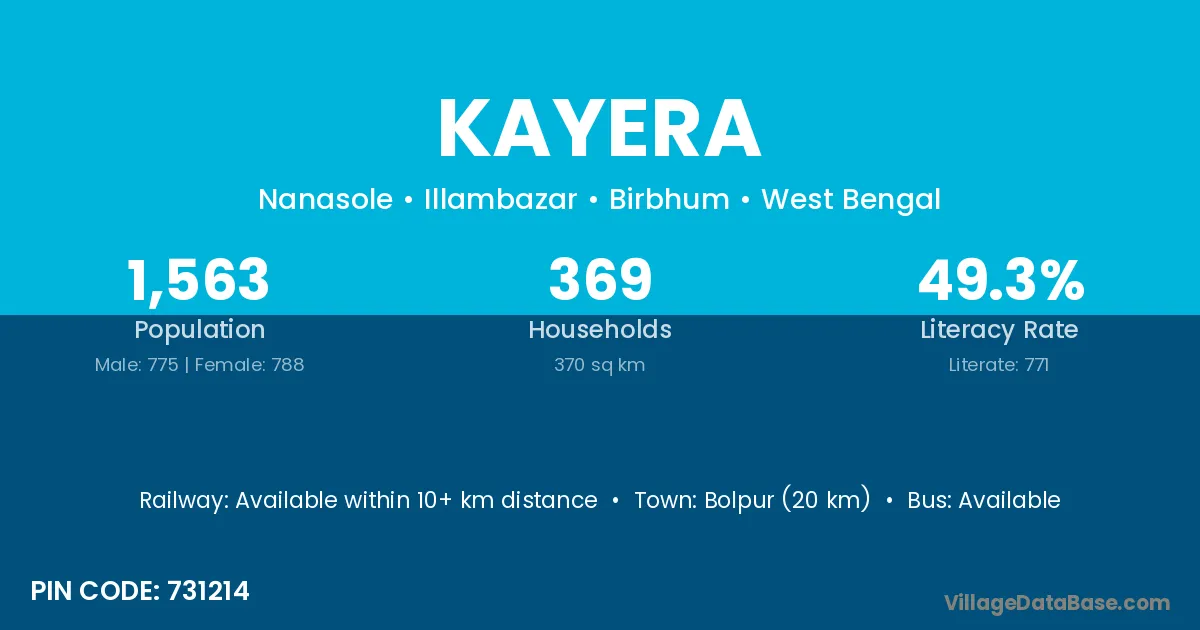 Bolpur (20 km) is the nearest town to Kayera village for major economic activities and is located approximately 20 km away.