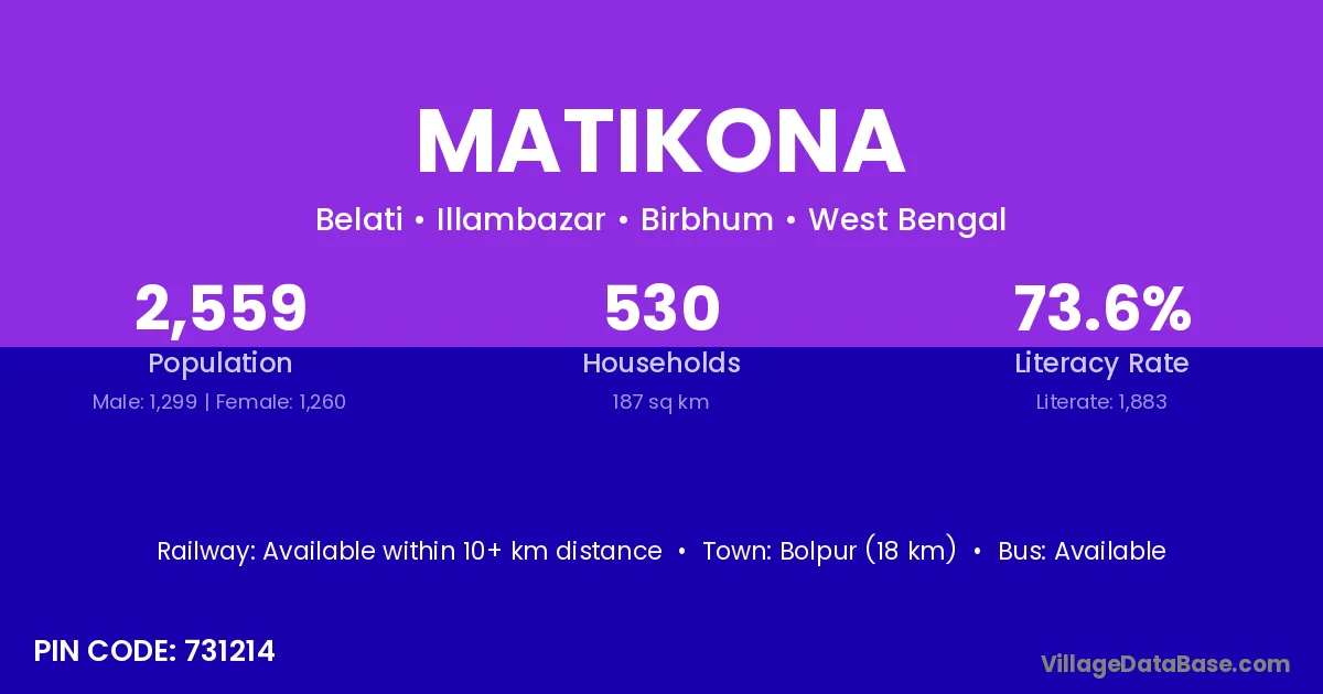 Bolpur (18 km) is the nearest town to Matikona village for major economic activities and is located approximately 18 km away.