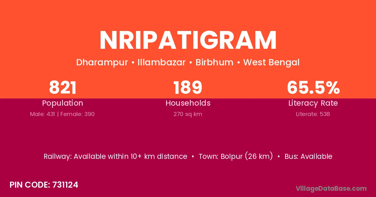 Bolpur (26 km) is the nearest town to Nripatigram village for major economic activities and is located approximately 26 km away.