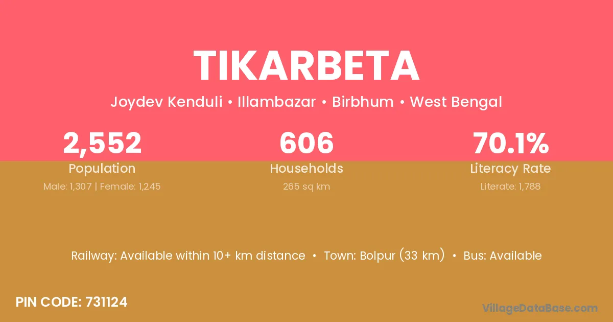Bolpur (33 km) is the nearest town to Tikarbeta village for major economic activities and is located approximately 33 km away.