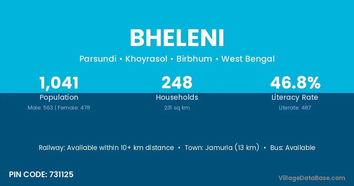 Jamuria (13 km) is the nearest town to Bheleni village for major economic activities and is located approximately 13 km away.