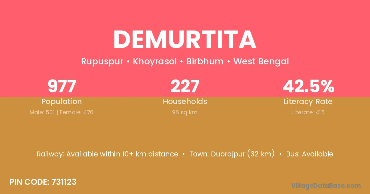 Dubrajpur (32 km) is the nearest town to Demurtita village for major economic activities and is located approximately 32 km away.