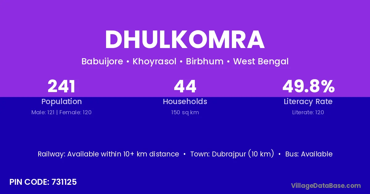 Dubrajpur (10 km) is the nearest town to Dhulkomra village for major economic activities and is located approximately 10 km away.