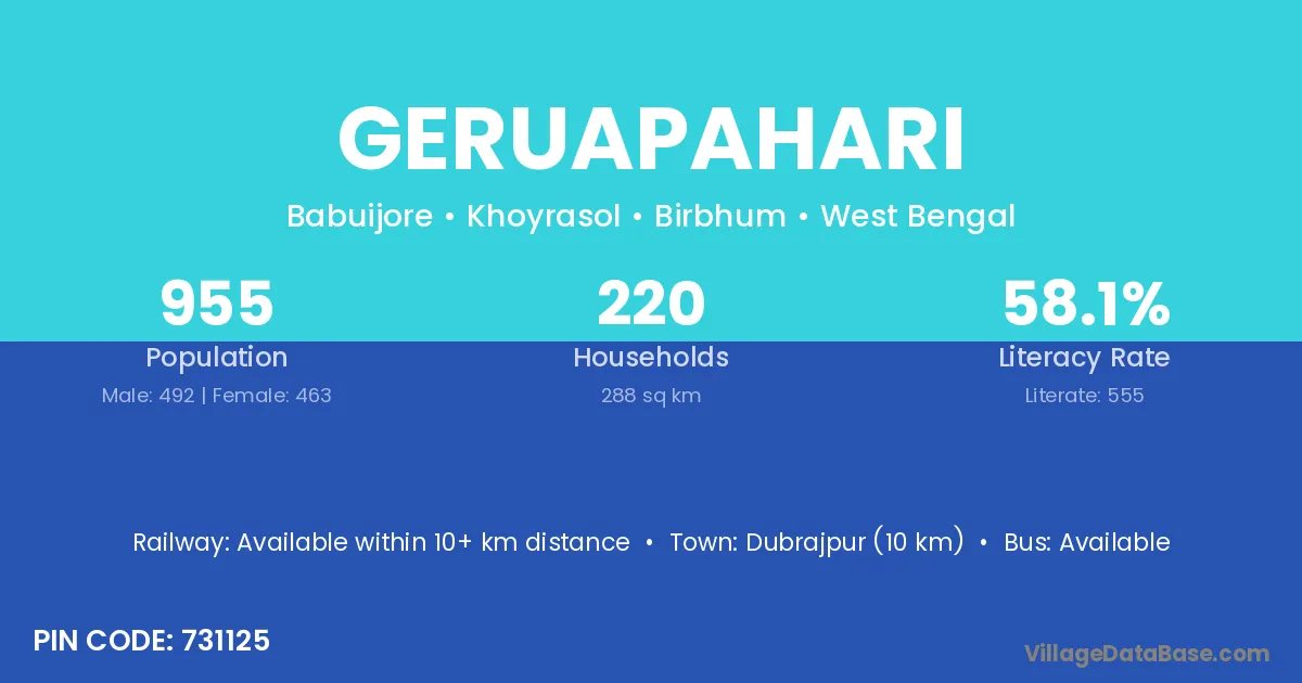 Dubrajpur (10 km) is the nearest town to Geruapahari village for major economic activities and is located approximately 10 km away.