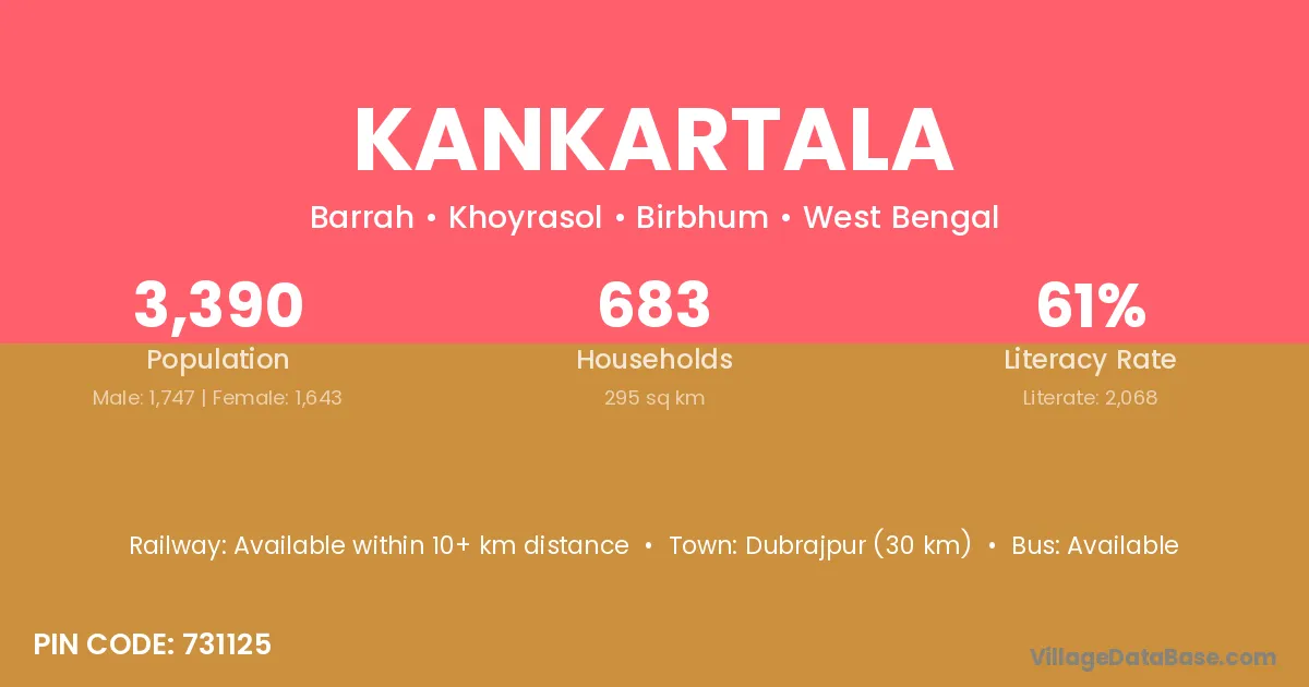 Dubrajpur (30 km) is the nearest town to Kankartala village for major economic activities and is located approximately 30 km away.