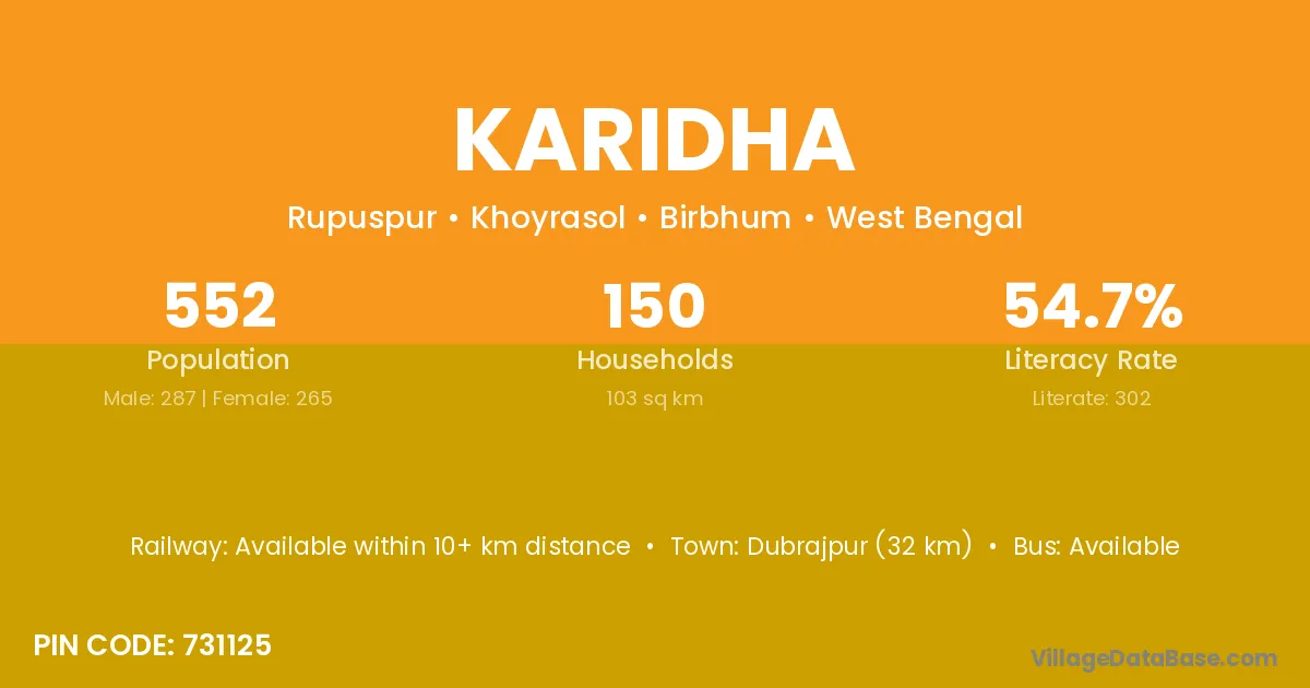 Dubrajpur (32 km) is the nearest town to Karidha village for major economic activities and is located approximately 32 km away.